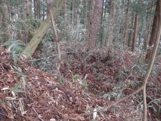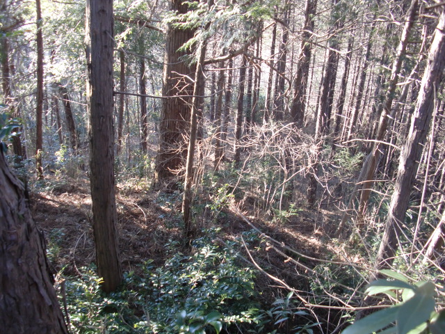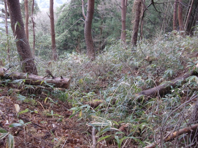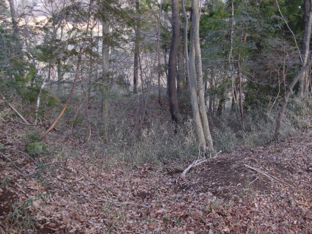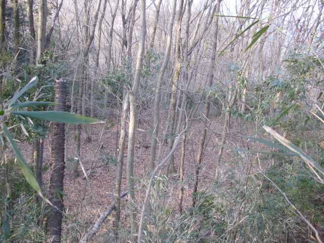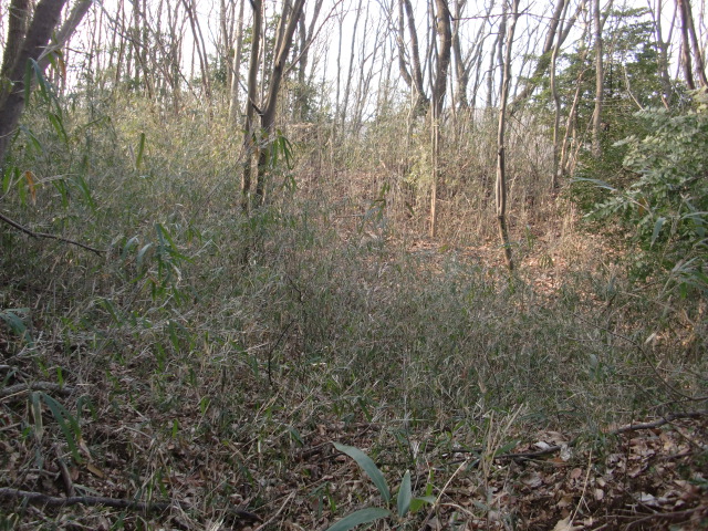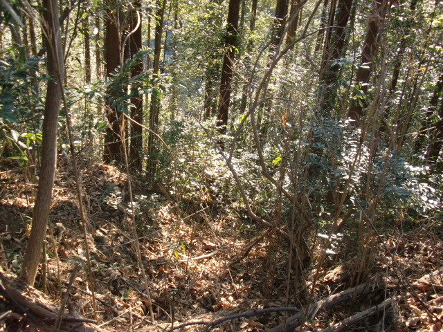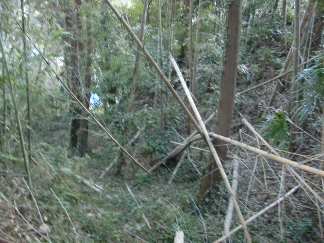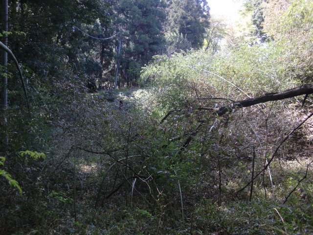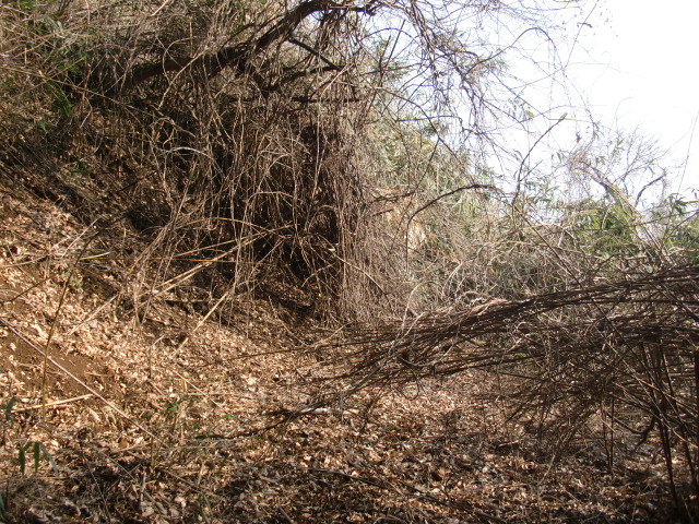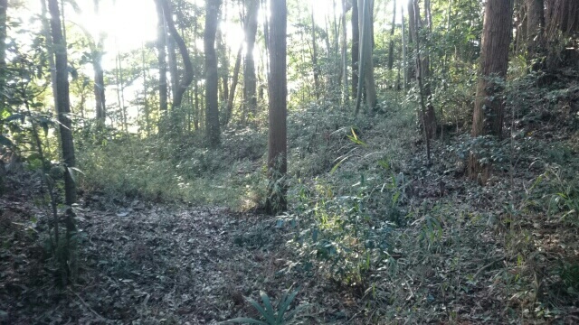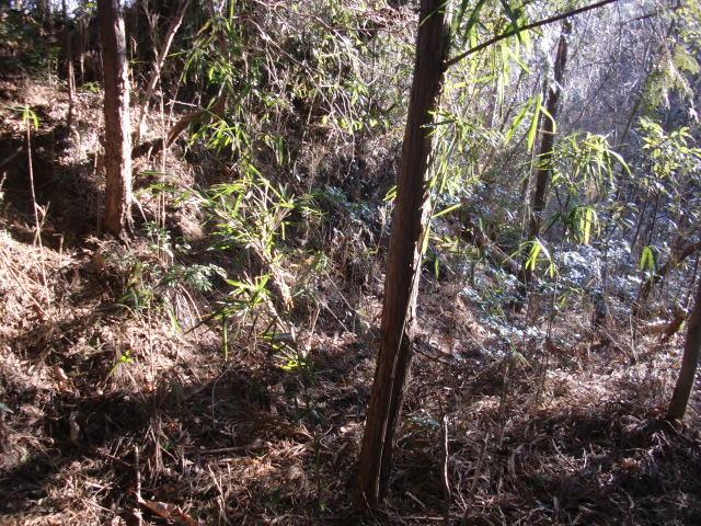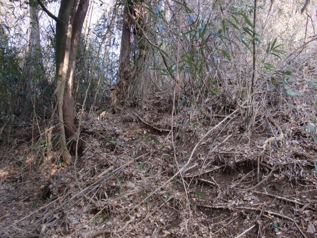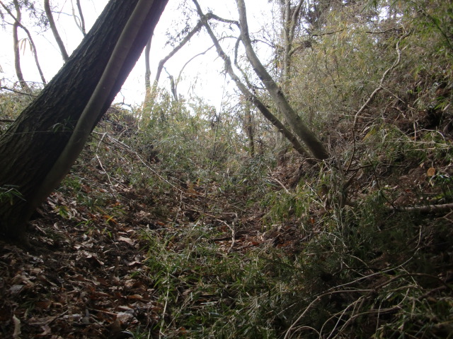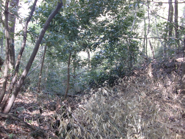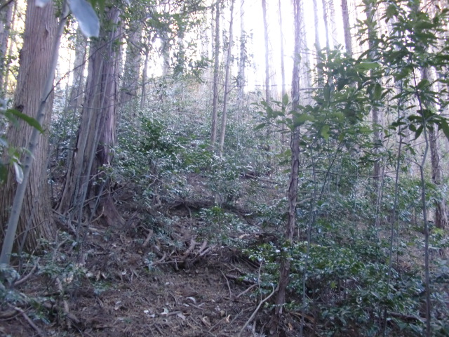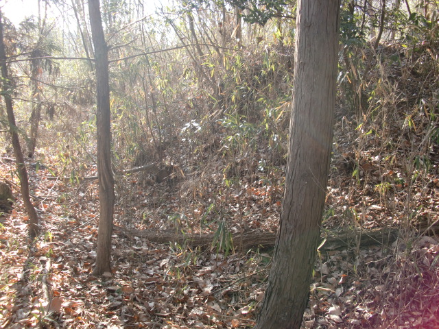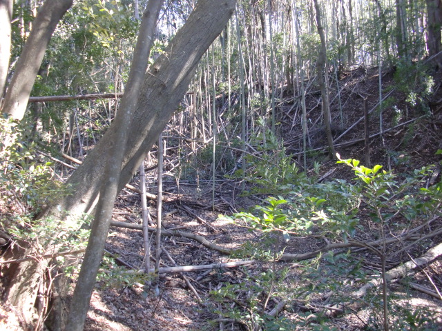 隣尾根には堀のような切れ目があり切れ目から上を目指すと尾根下に広い藪スペースへ・・・