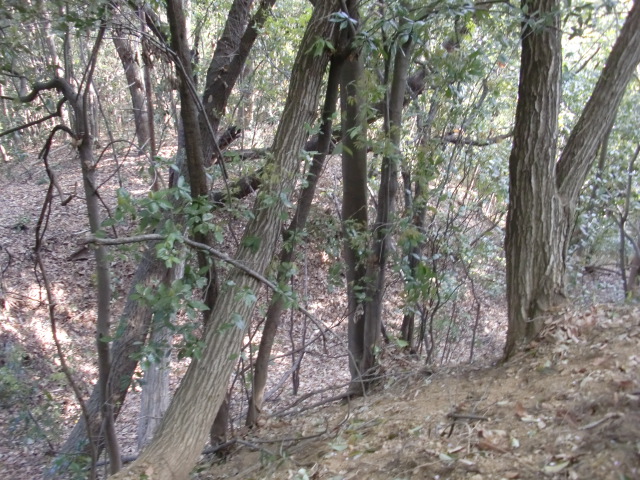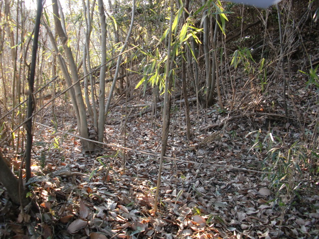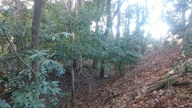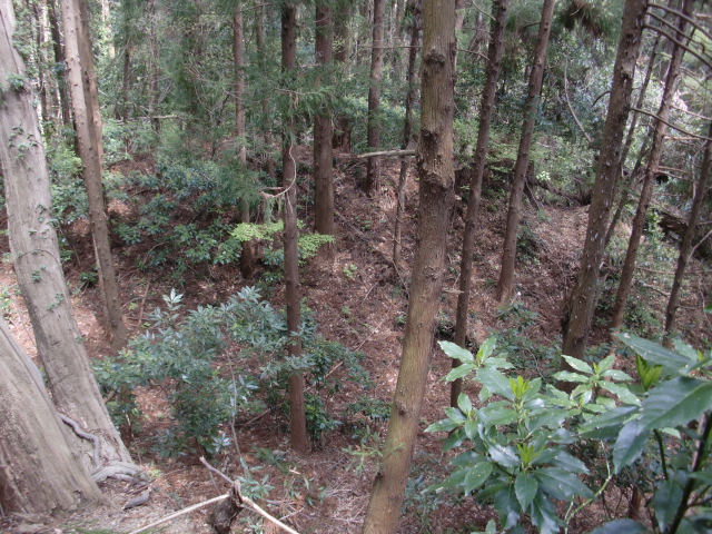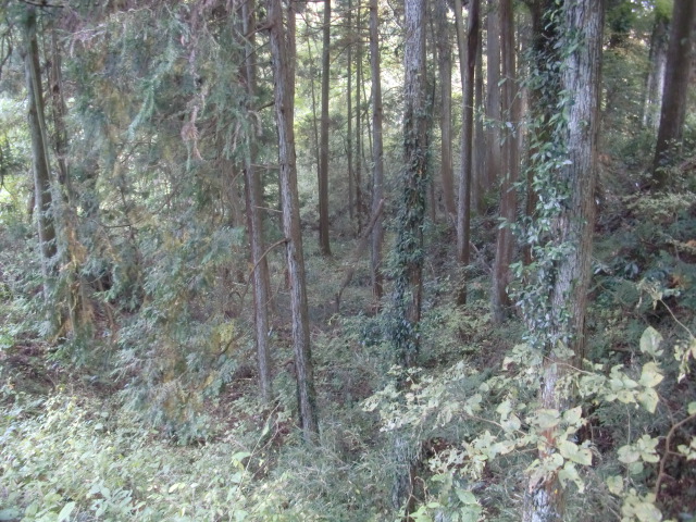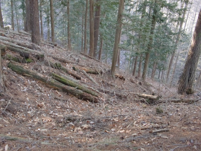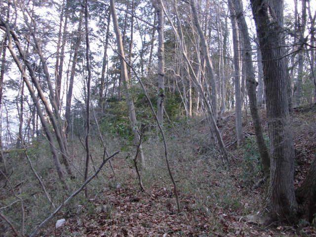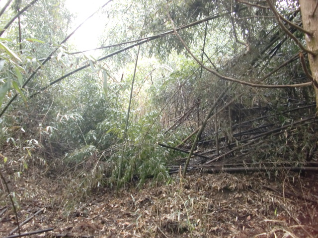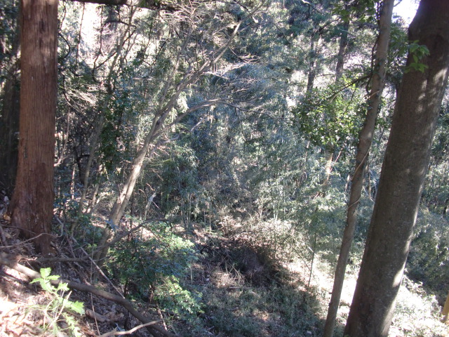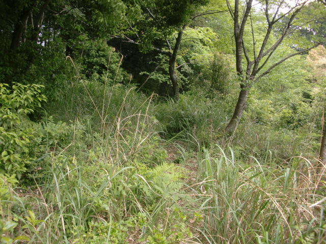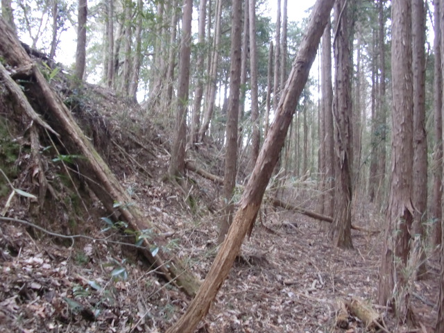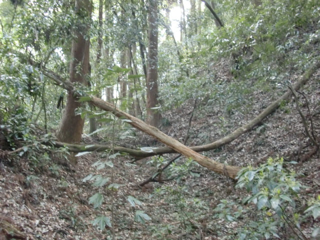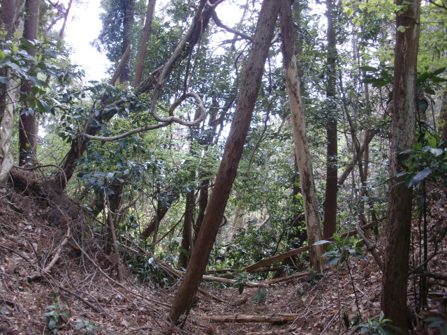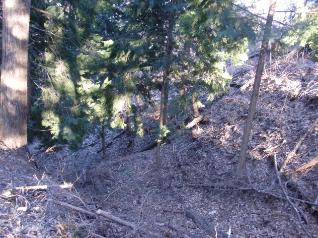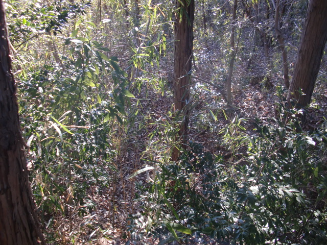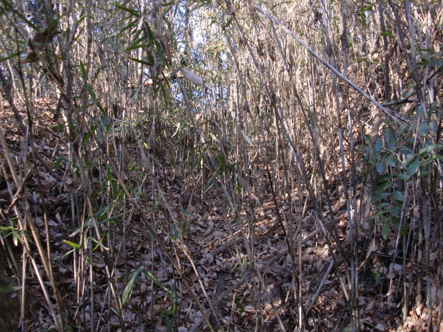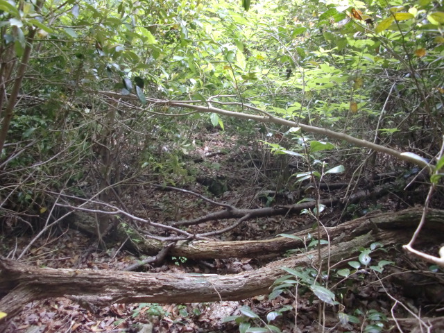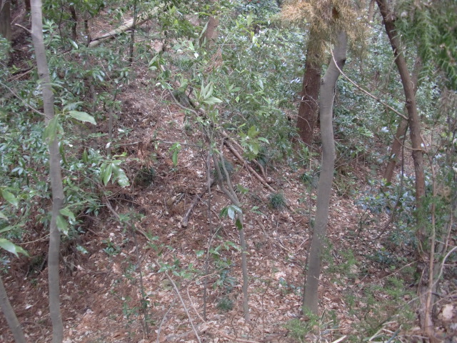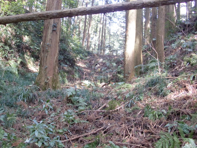 隣尾根には堀のような切れ目があり切れ目から上を目指すと尾根下に広い藪スペースへ・・・