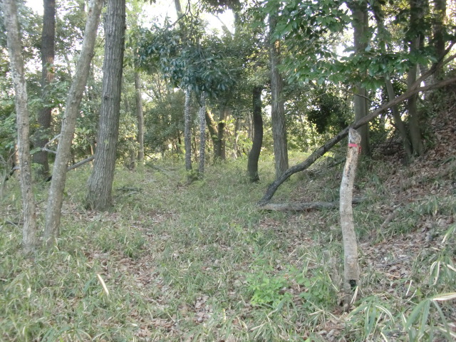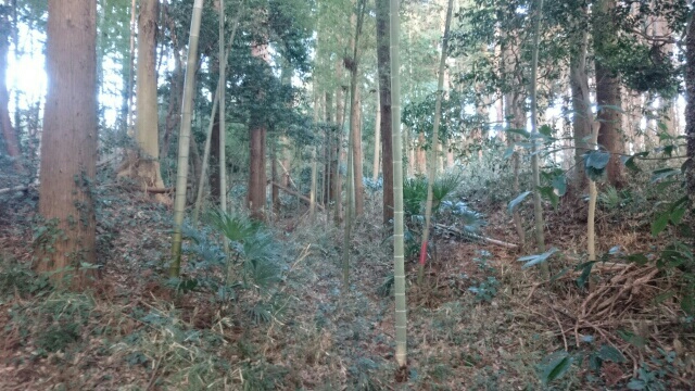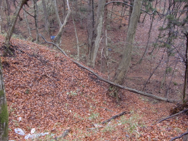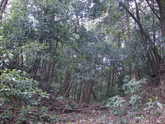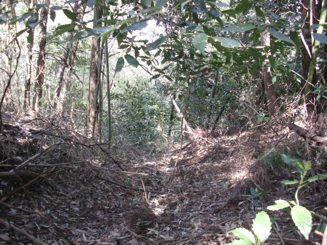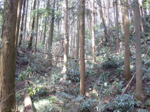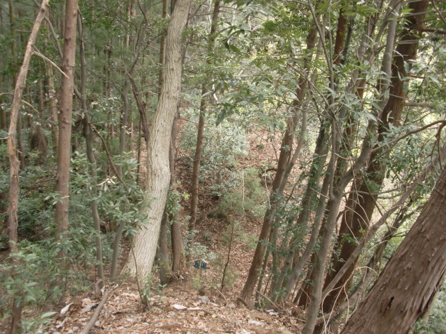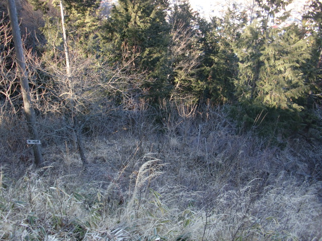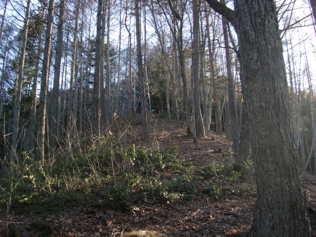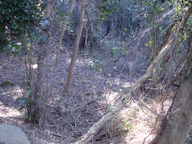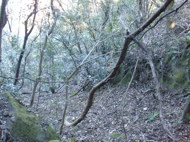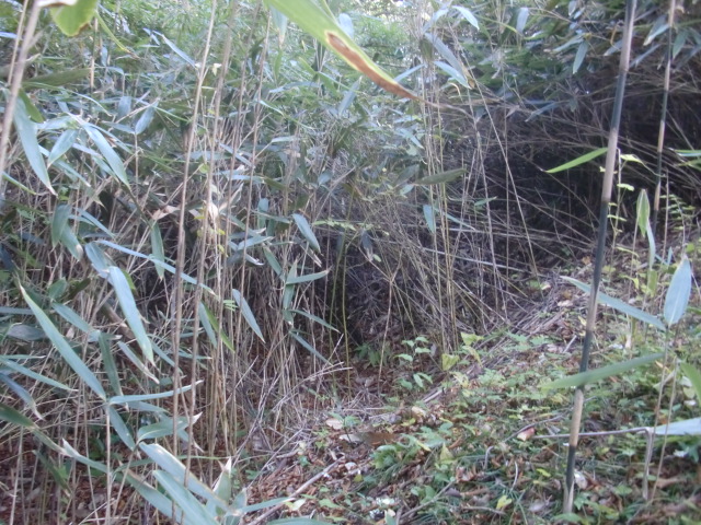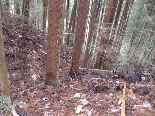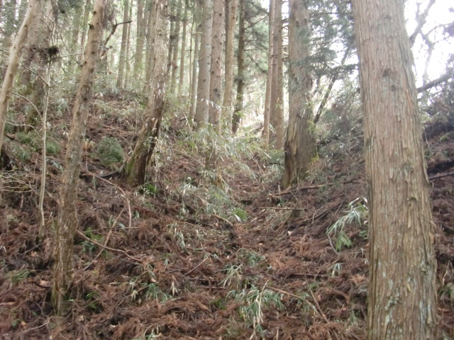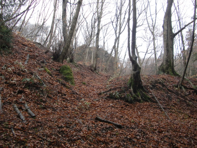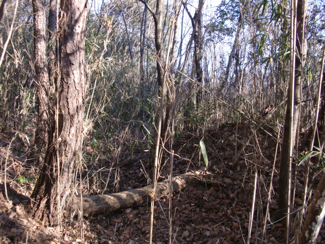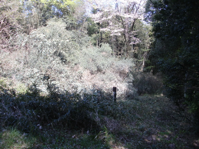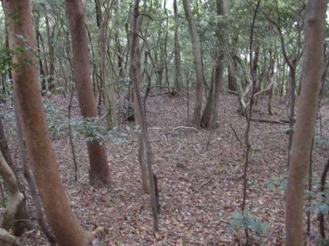 隣尾根には堀のような切れ目があり切れ目から上を目指すと尾根下に広い藪スペースへ・・・