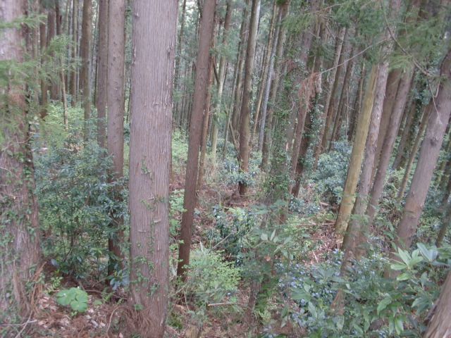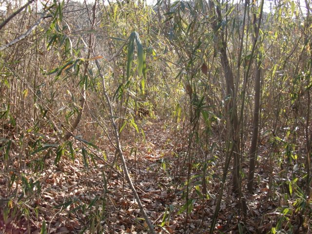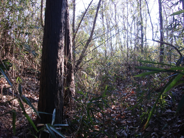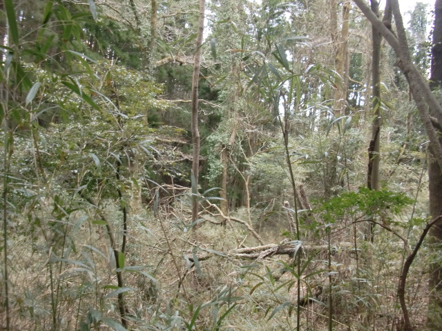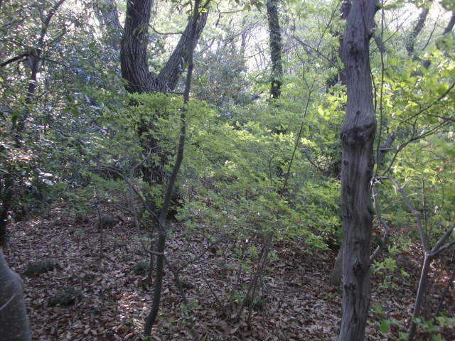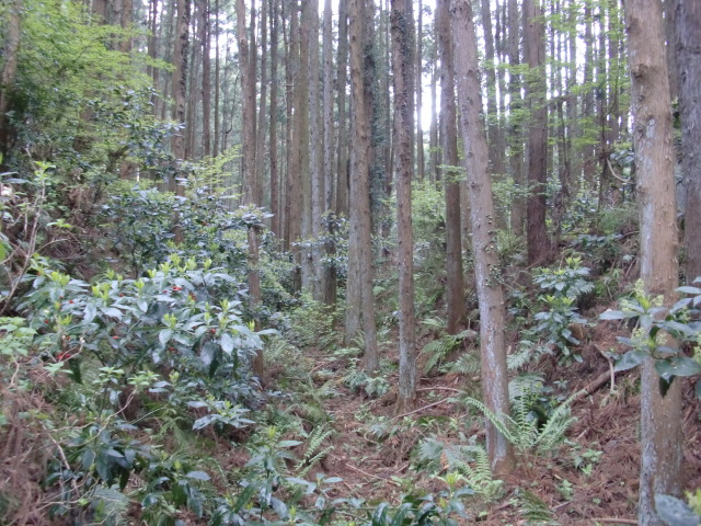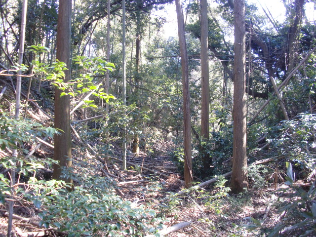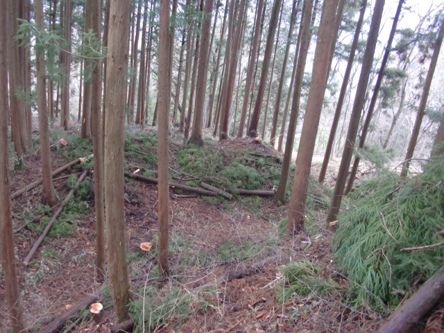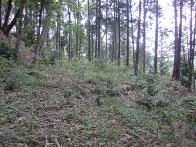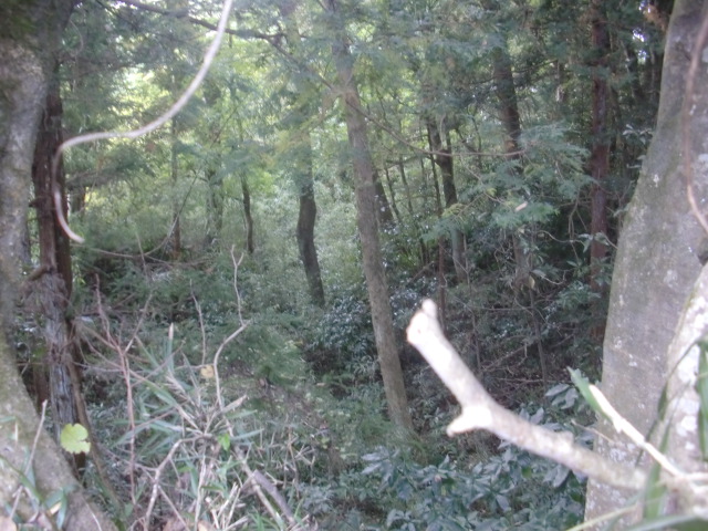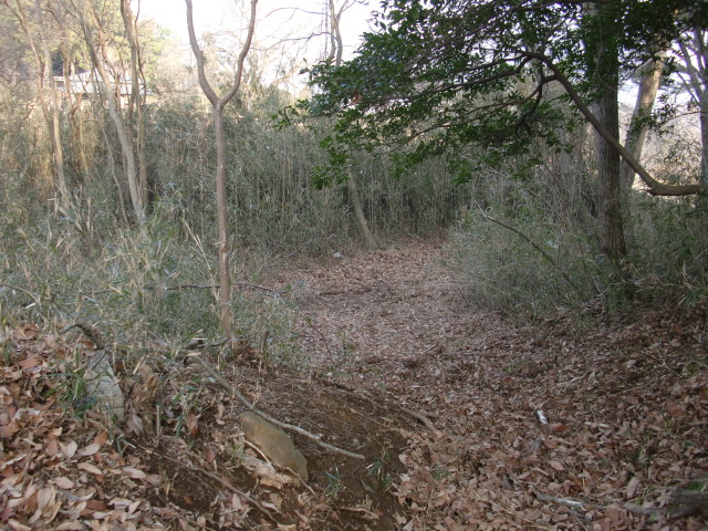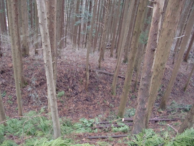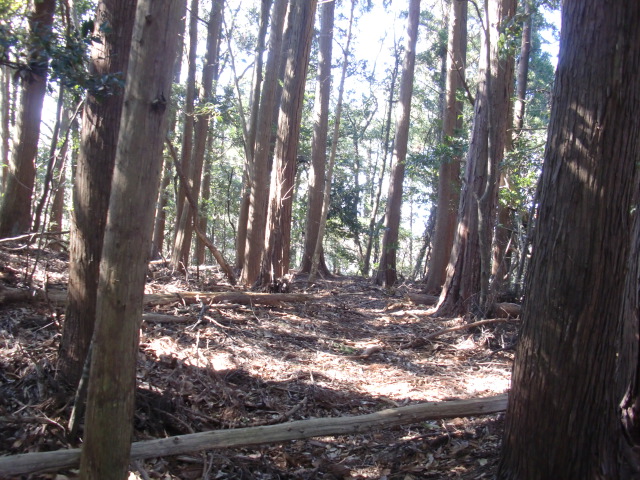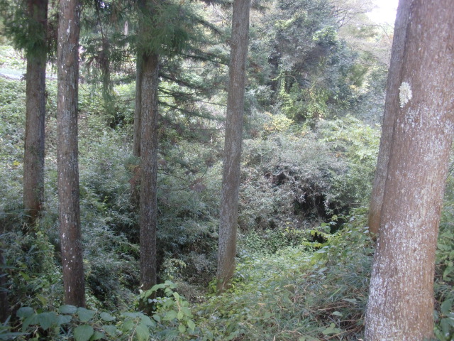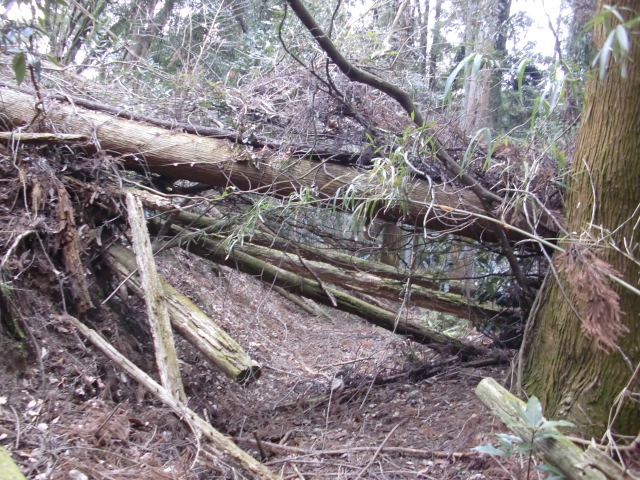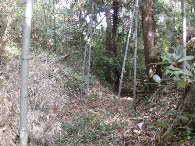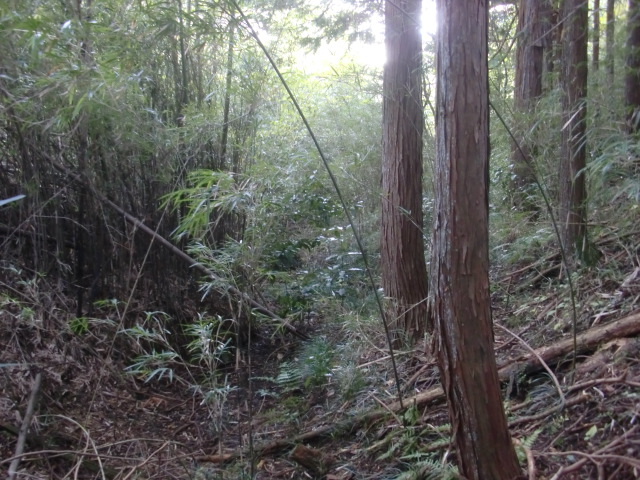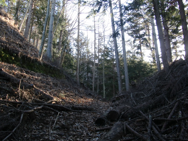 隣尾根には堀のような切れ目があり切れ目から上を目指すと尾根下に広い藪スペースへ・・・