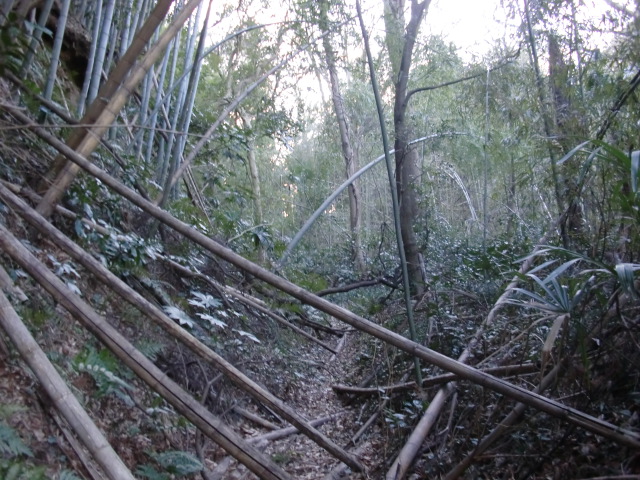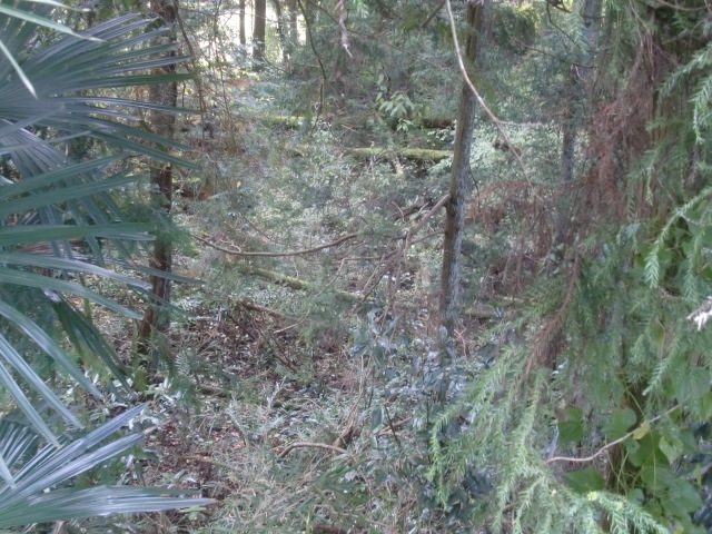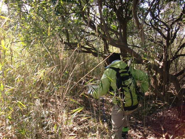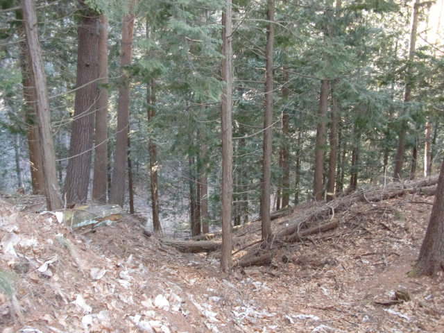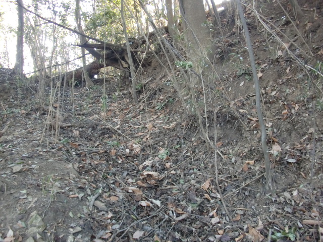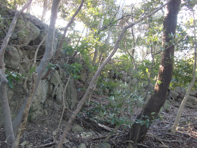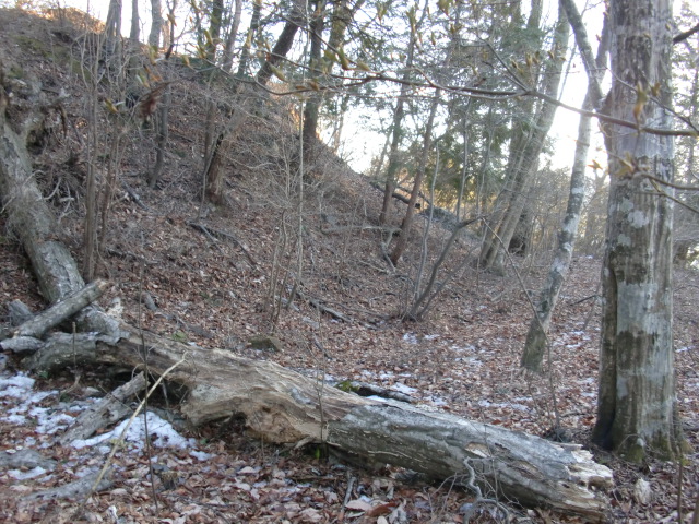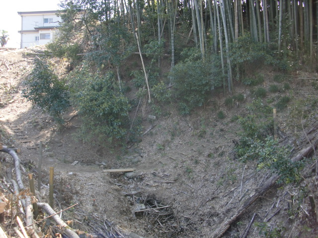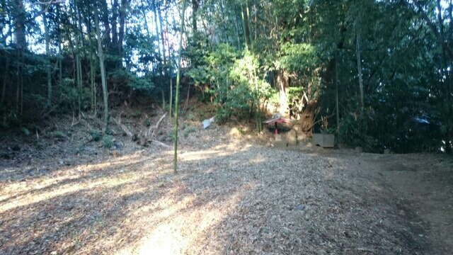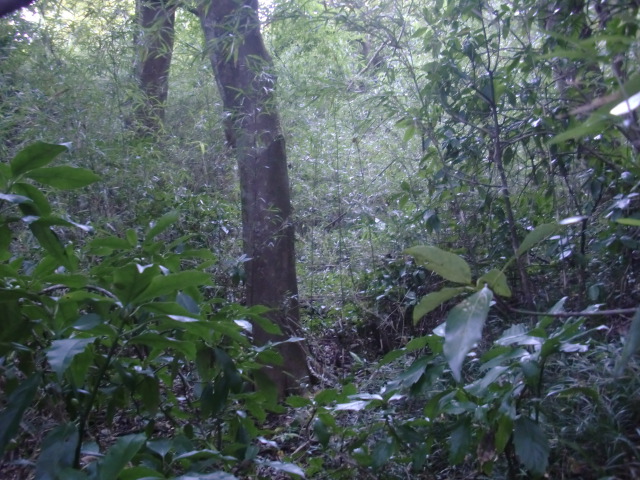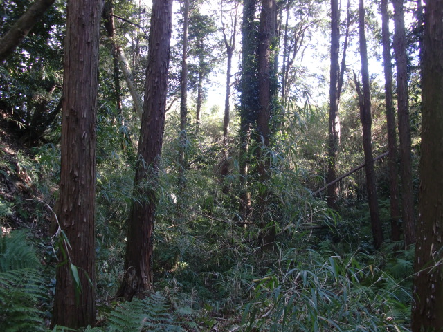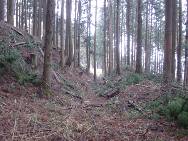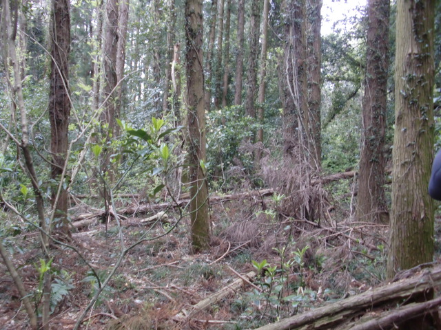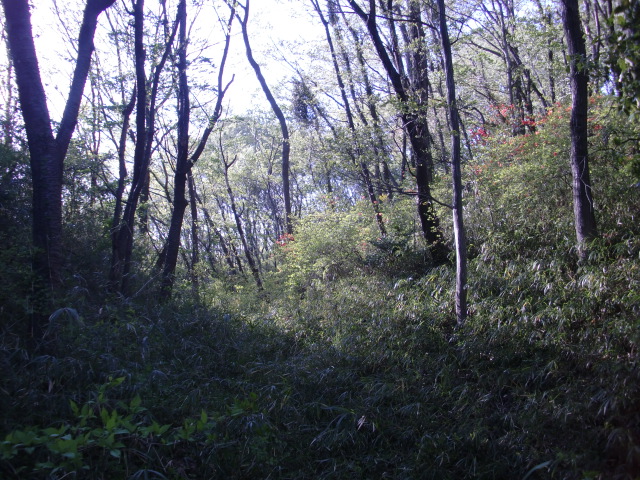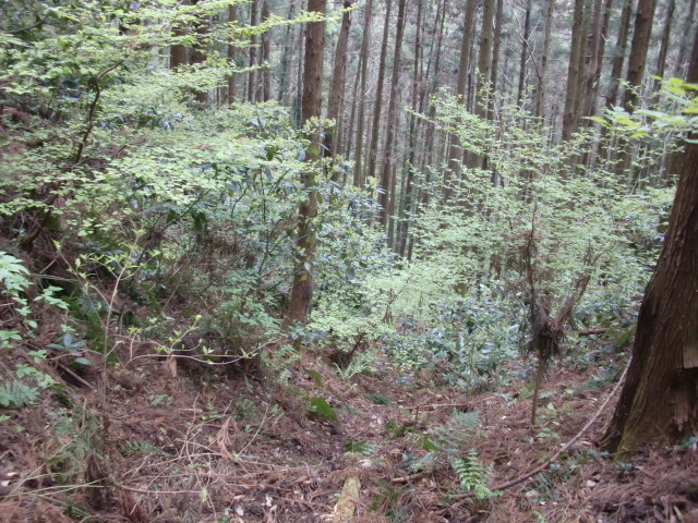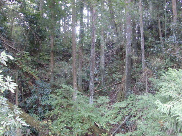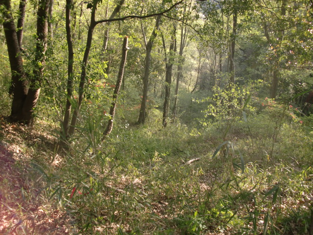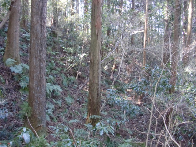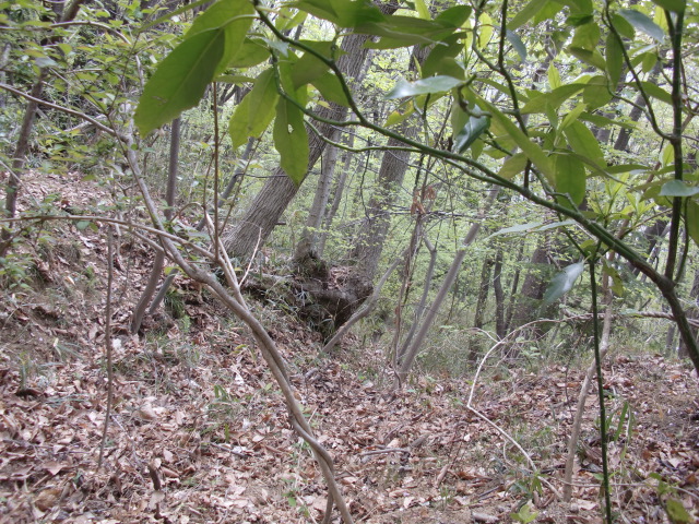 隣尾根には堀のような切れ目があり切れ目から上を目指すと尾根下に広い藪スペースへ・・・