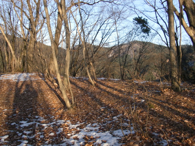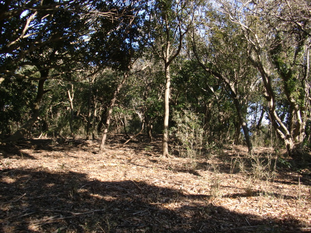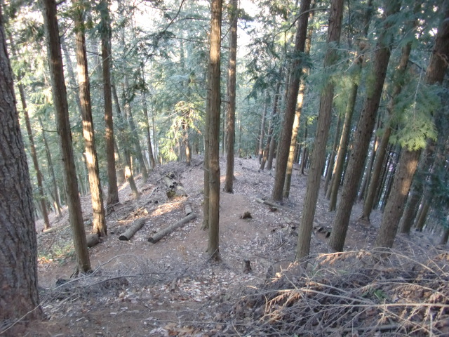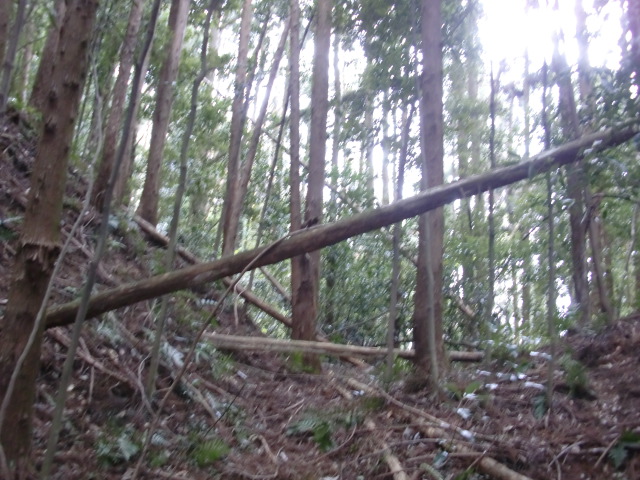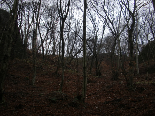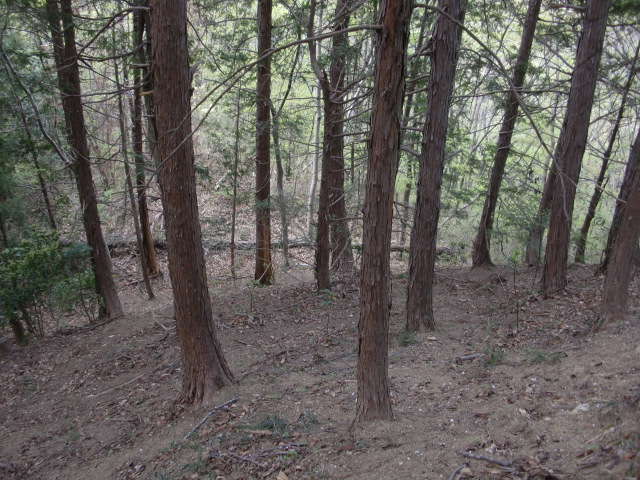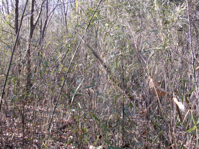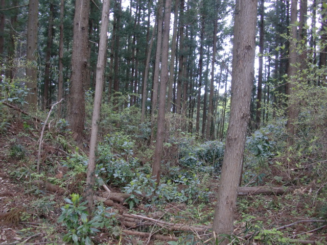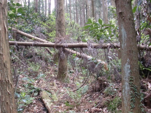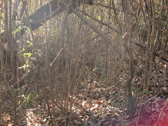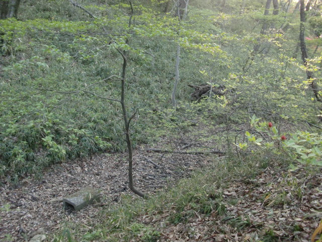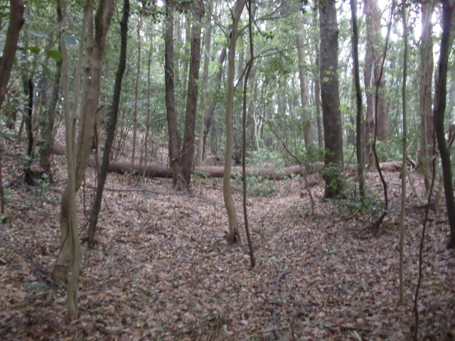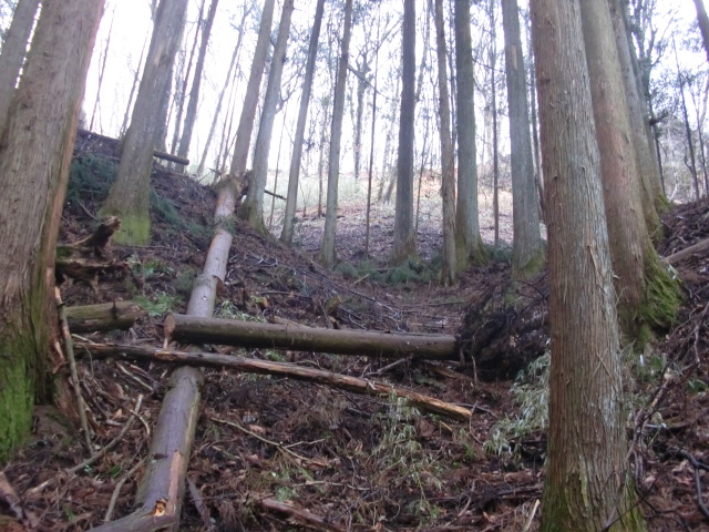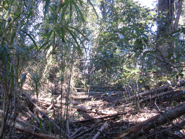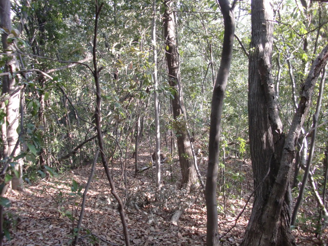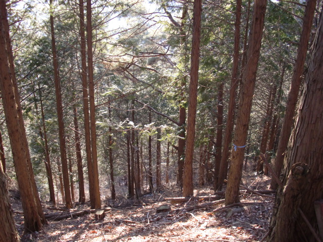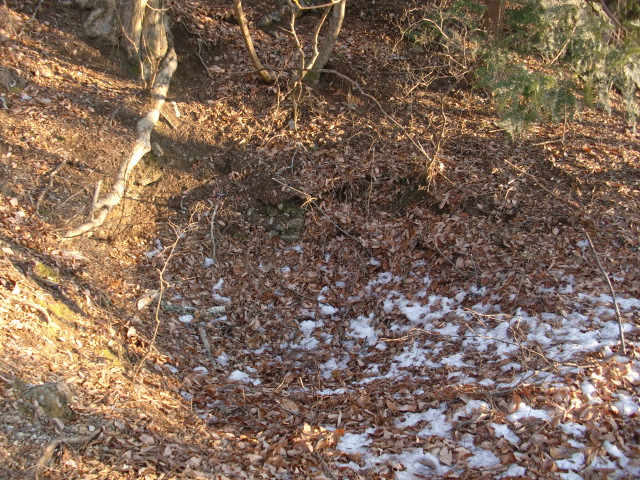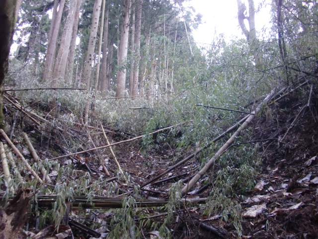 隣尾根には堀のような切れ目があり切れ目から上を目指すと尾根下に広い藪スペースへ・・・