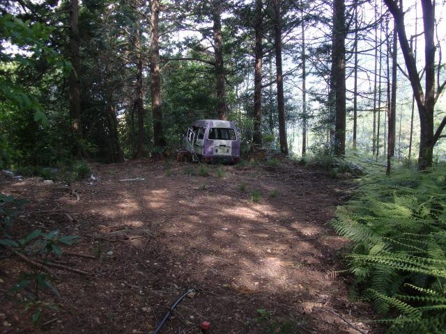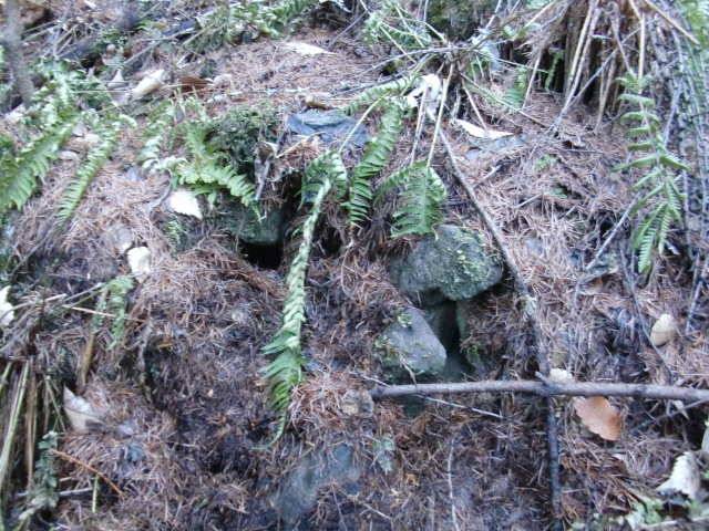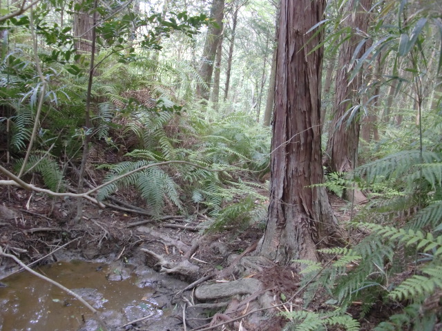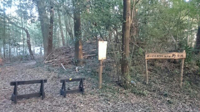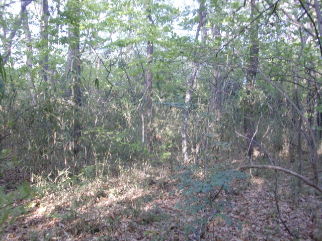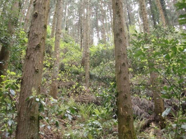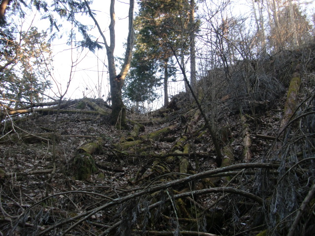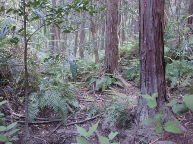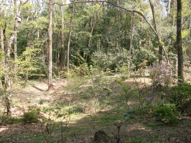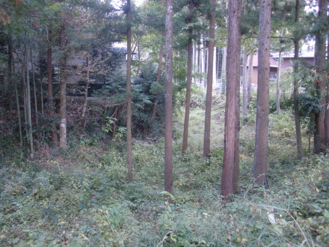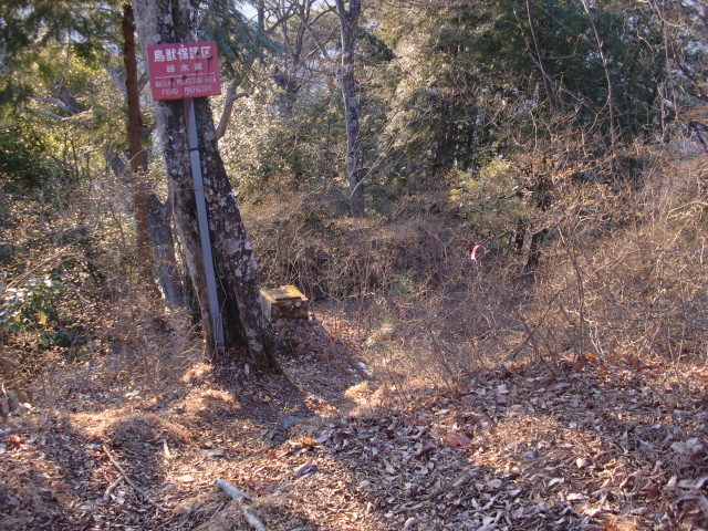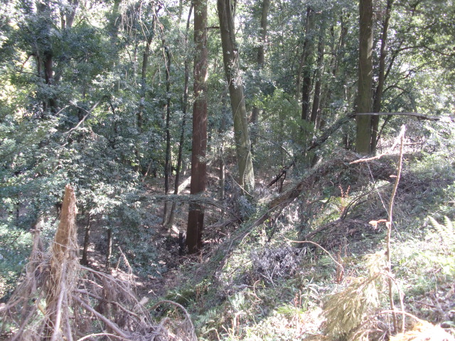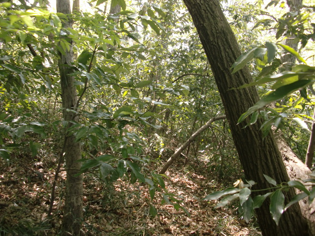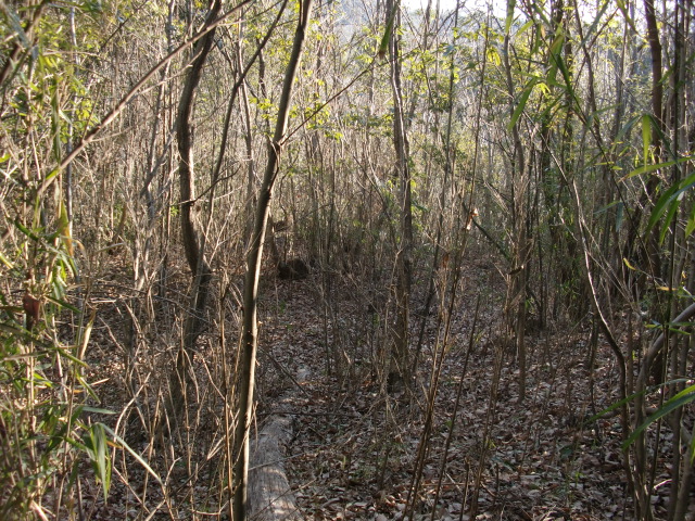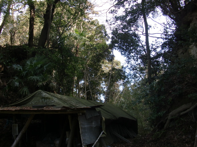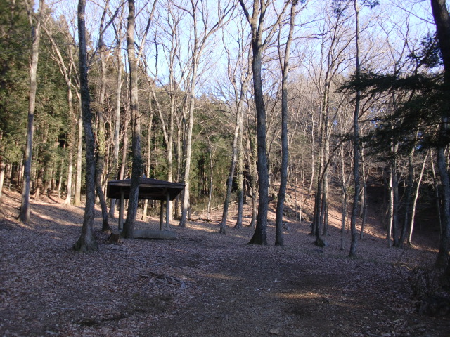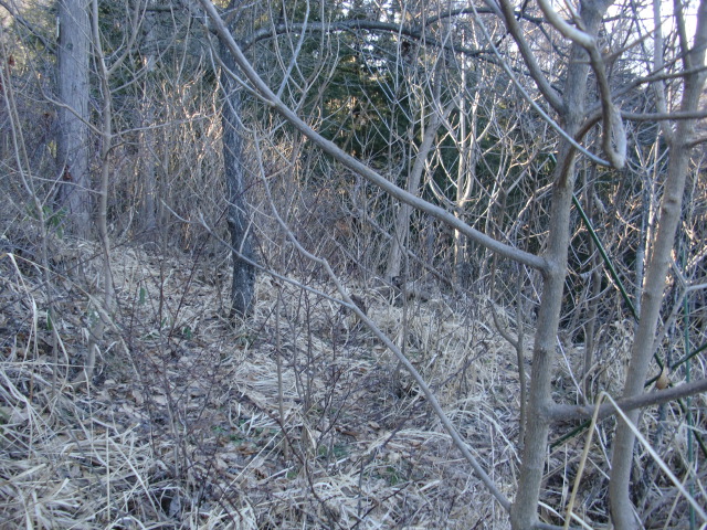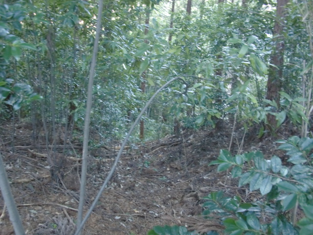 隣尾根には堀のような切れ目があり切れ目から上を目指すと尾根下に広い藪スペースへ・・・