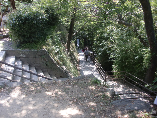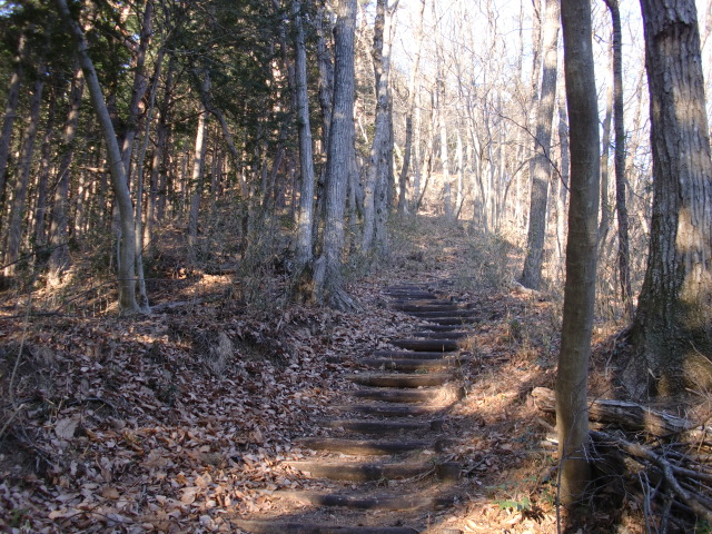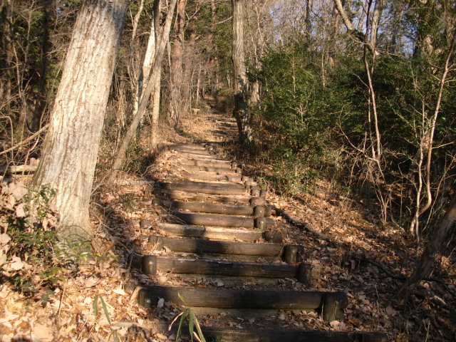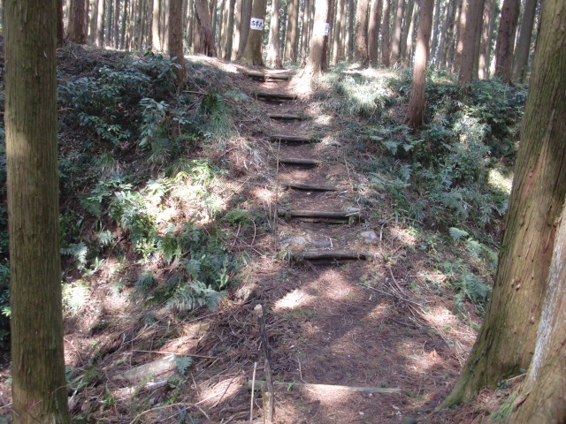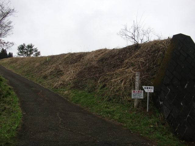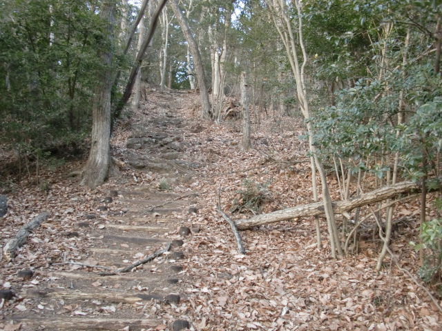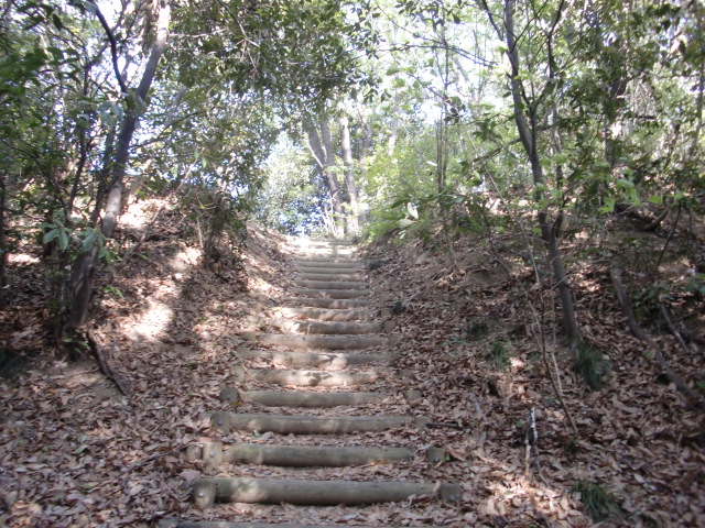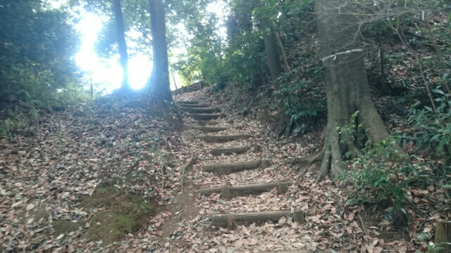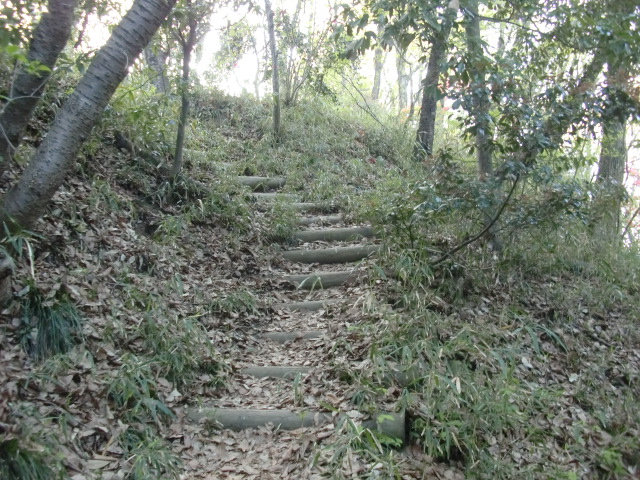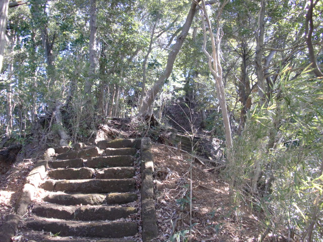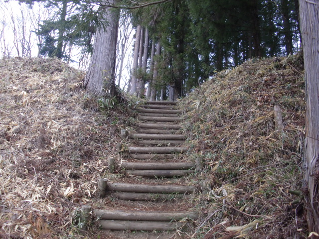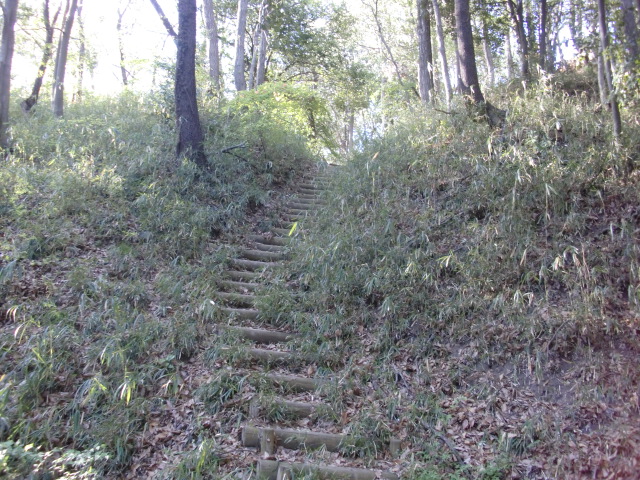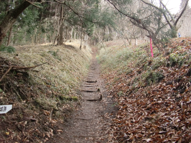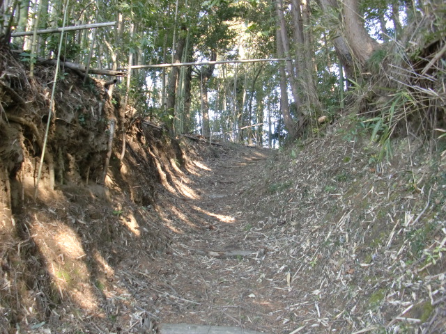 切岸階段を進んで行くと整備された道となり西側から階段で主郭北野神社南堀へすんなりと向かえますが・・・