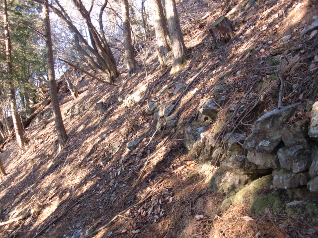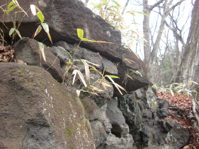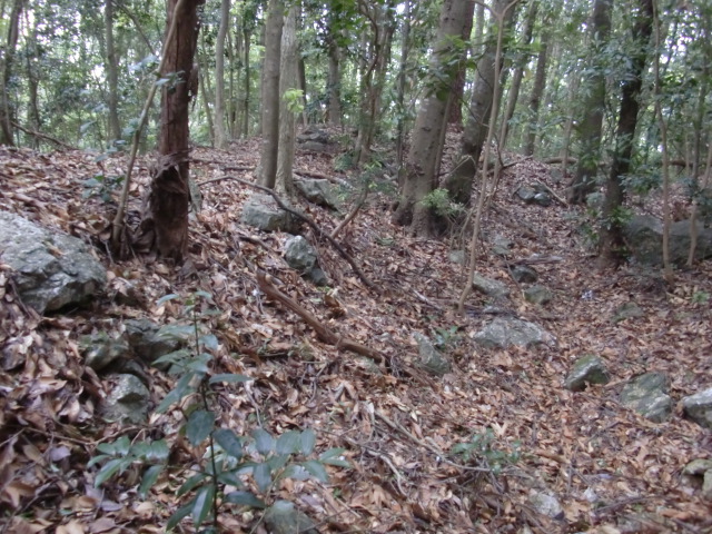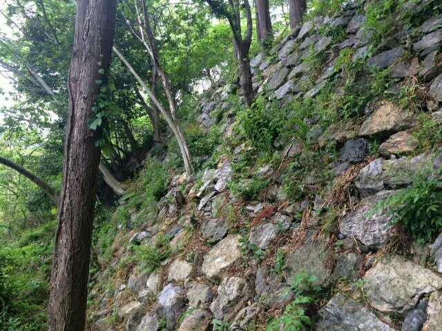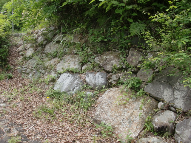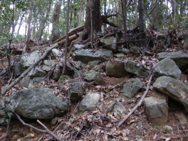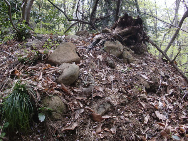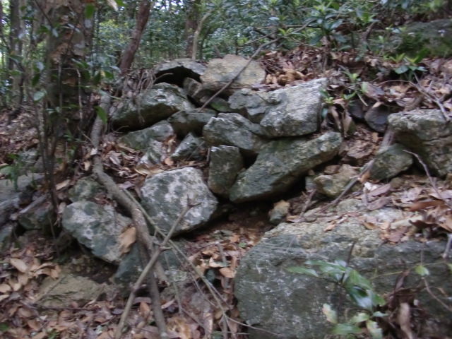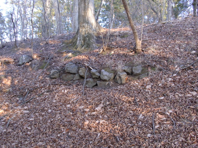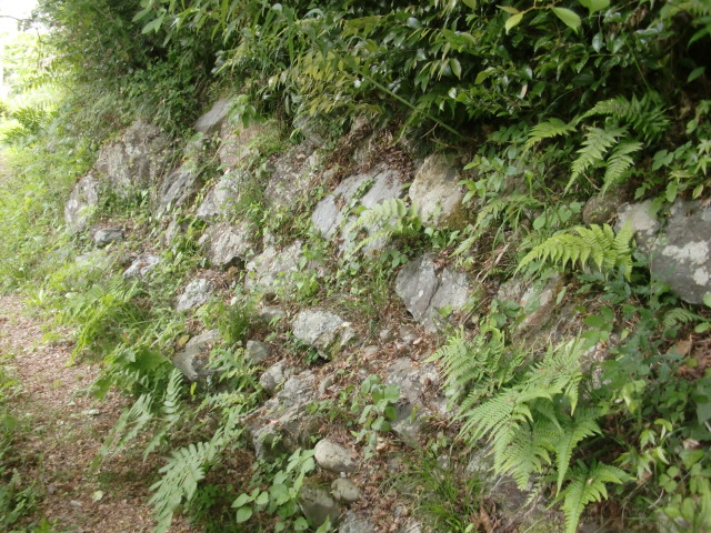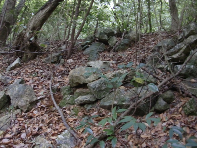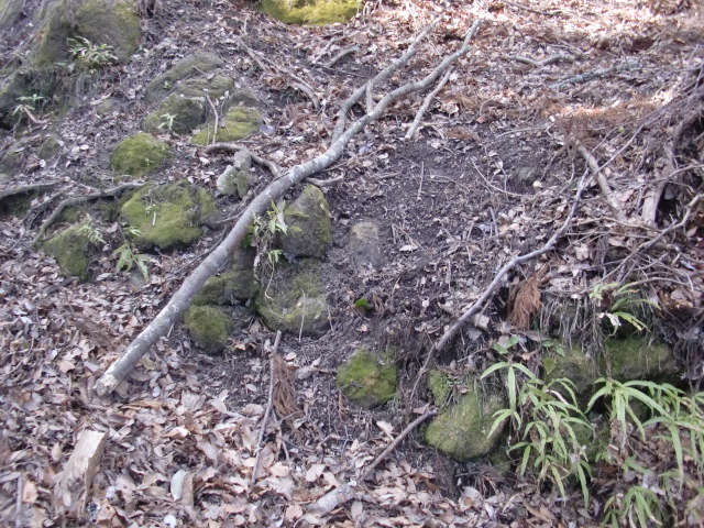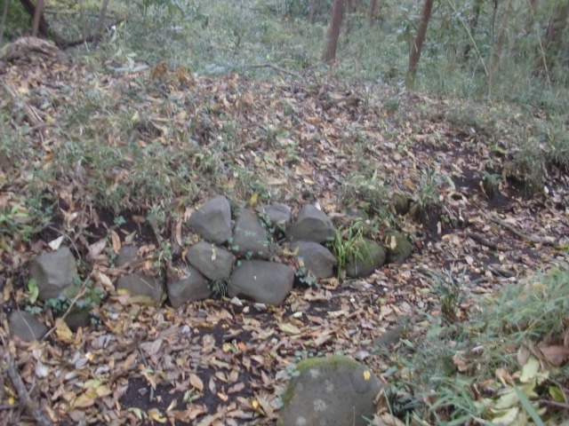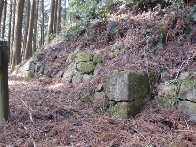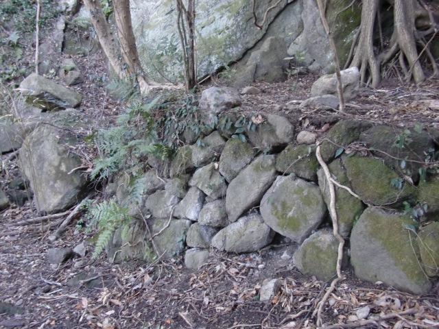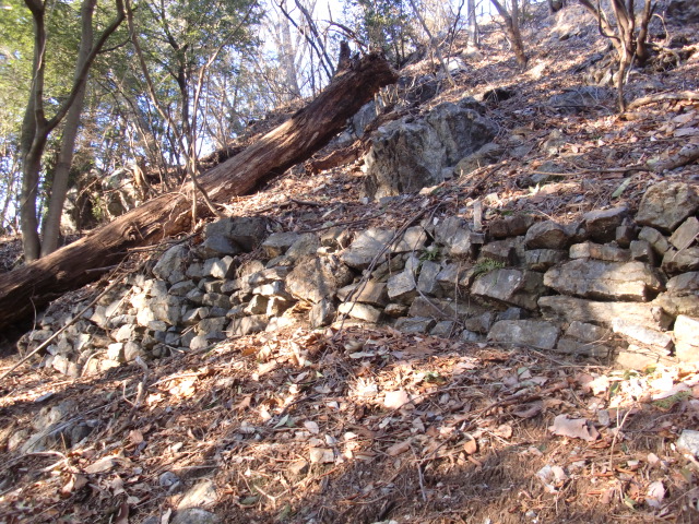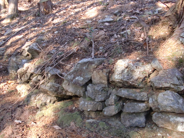 虎口から尾根郭の東側には随所に土留めの石積みが残ってます♪