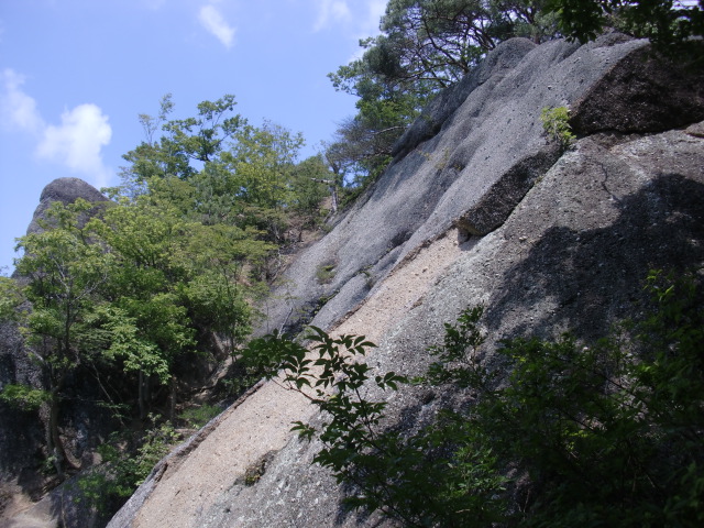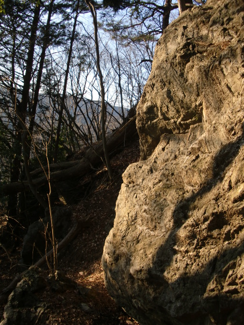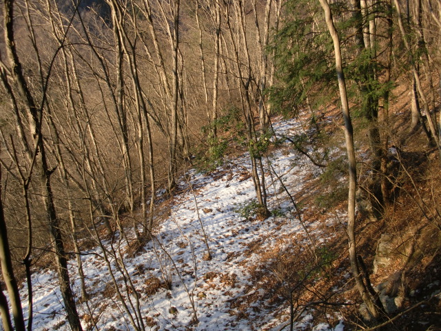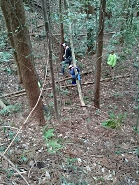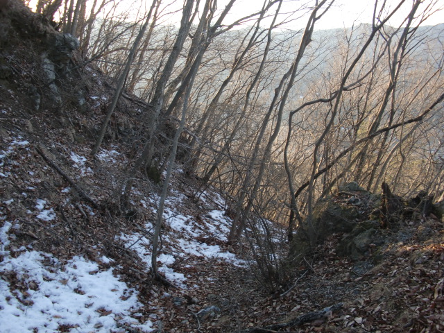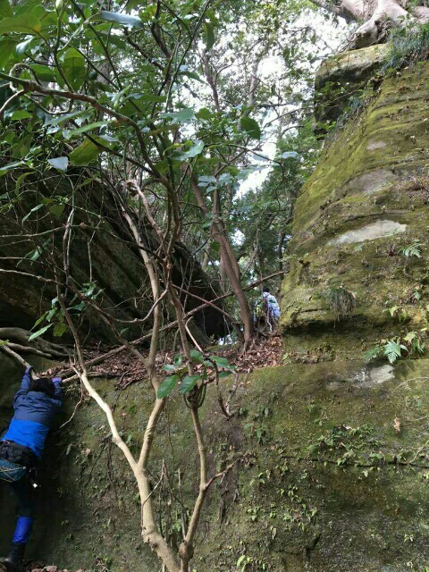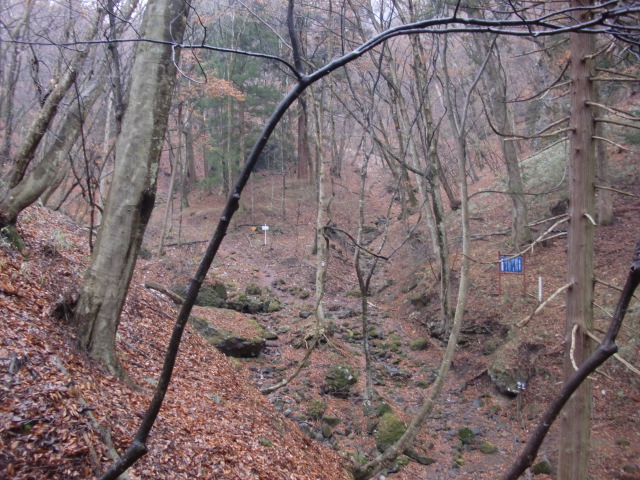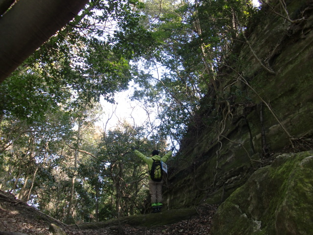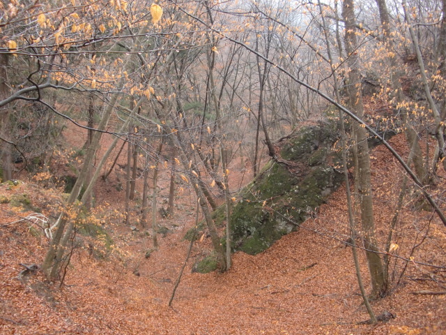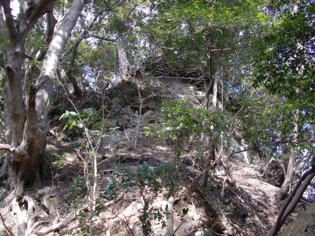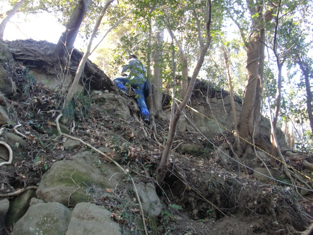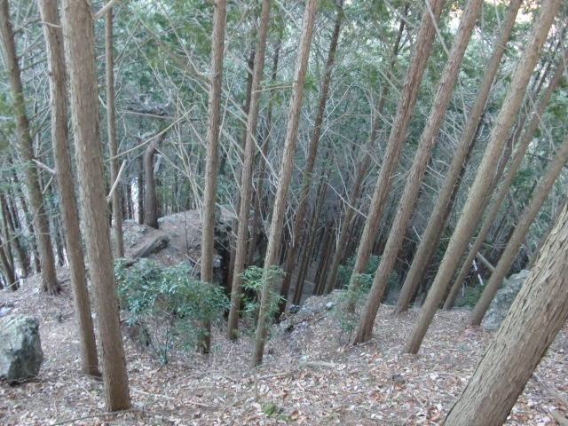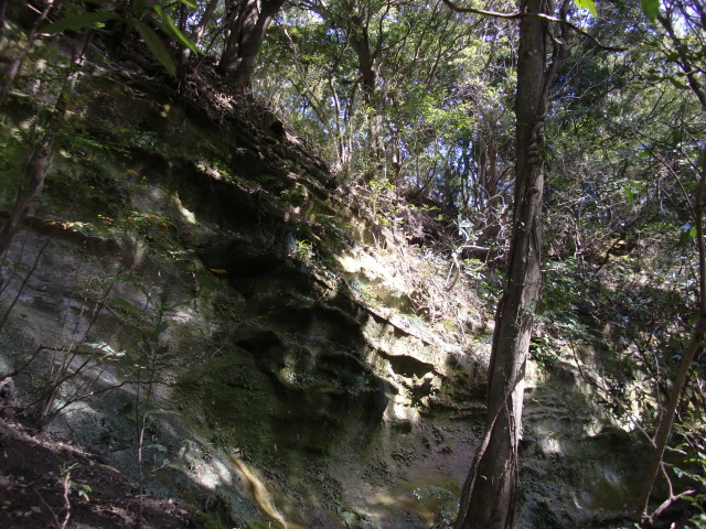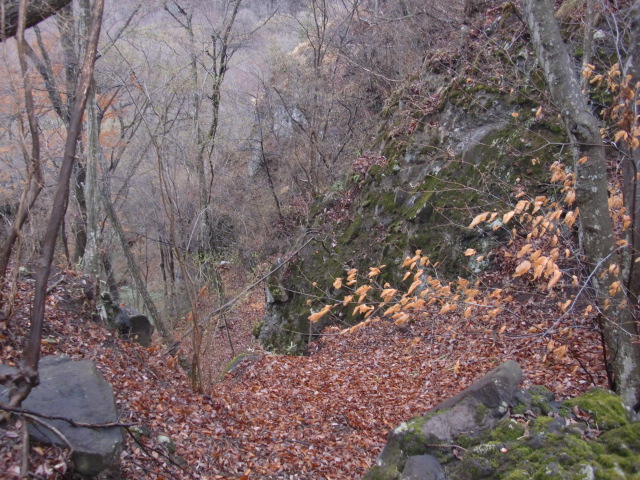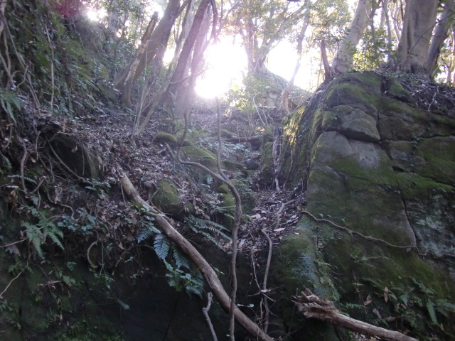 尾根はそのまま駐車場方面へ下ってしまうので斜面を下り隣の尾根に向かうも岩盤の竪堀のような谷にf(-_-;)