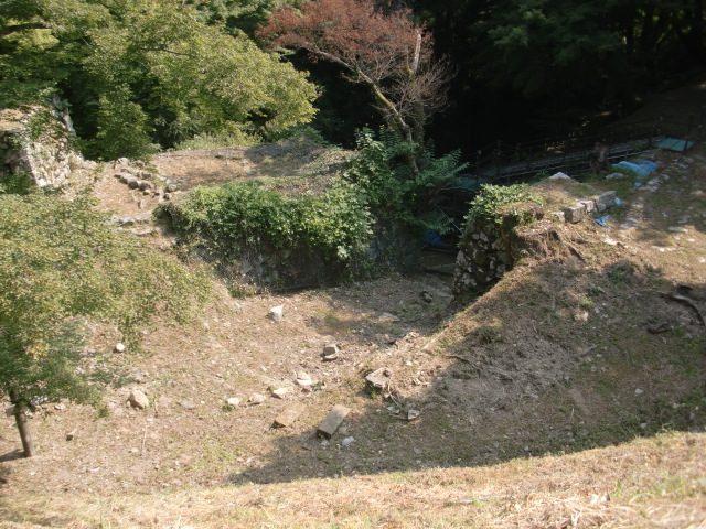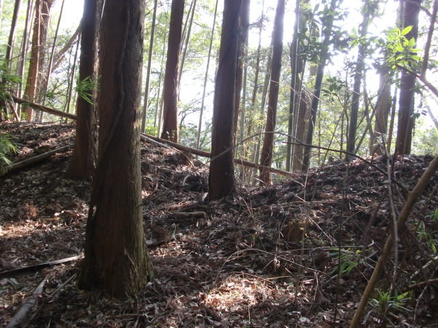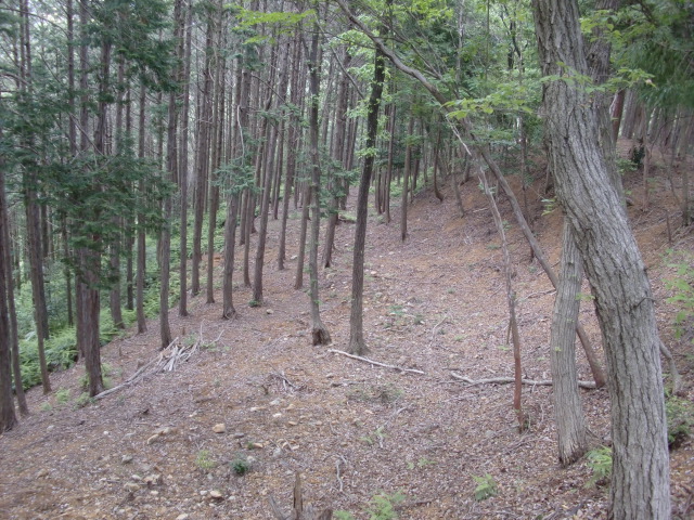 南側にも郭群が続きますが藪が酷く・・・藪漕ぎしながら下ると堀があるも満喫できずに主郭へ((+_+))