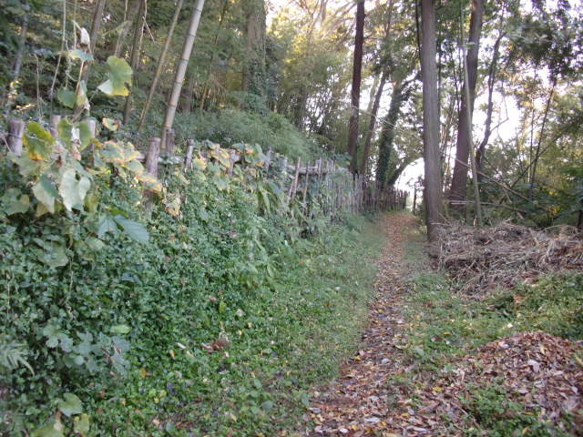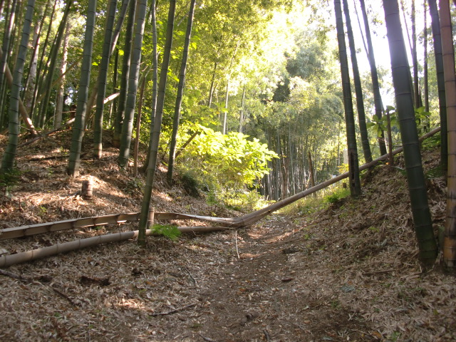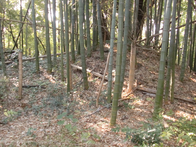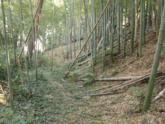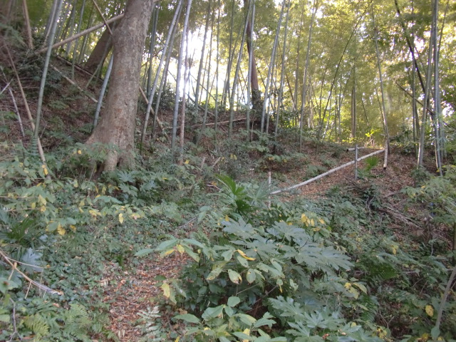 主郭の土塁に囲まれた郭に沿って藪を抜けると東腰郭へ…