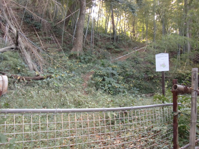 城跡近くの49799234*24辺りのスペースに車をとめて住宅地を西に向かうと主郭・2郭間の堀から城跡に入れますが…